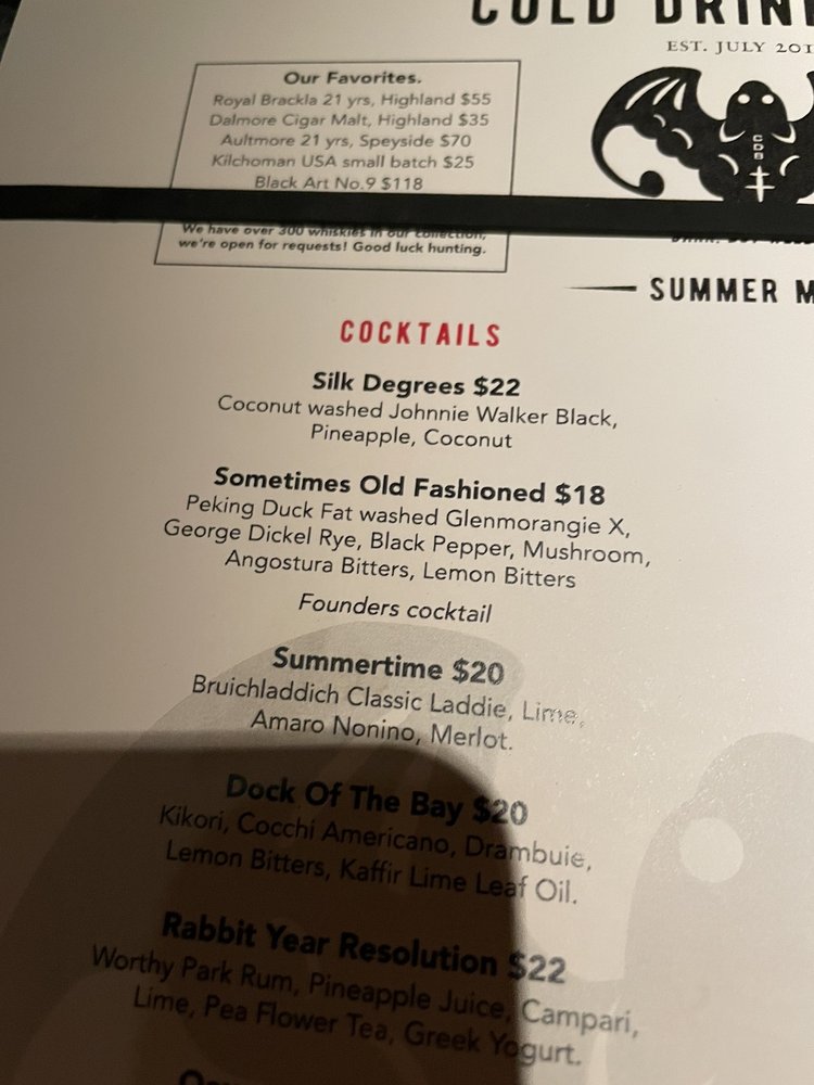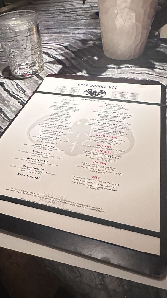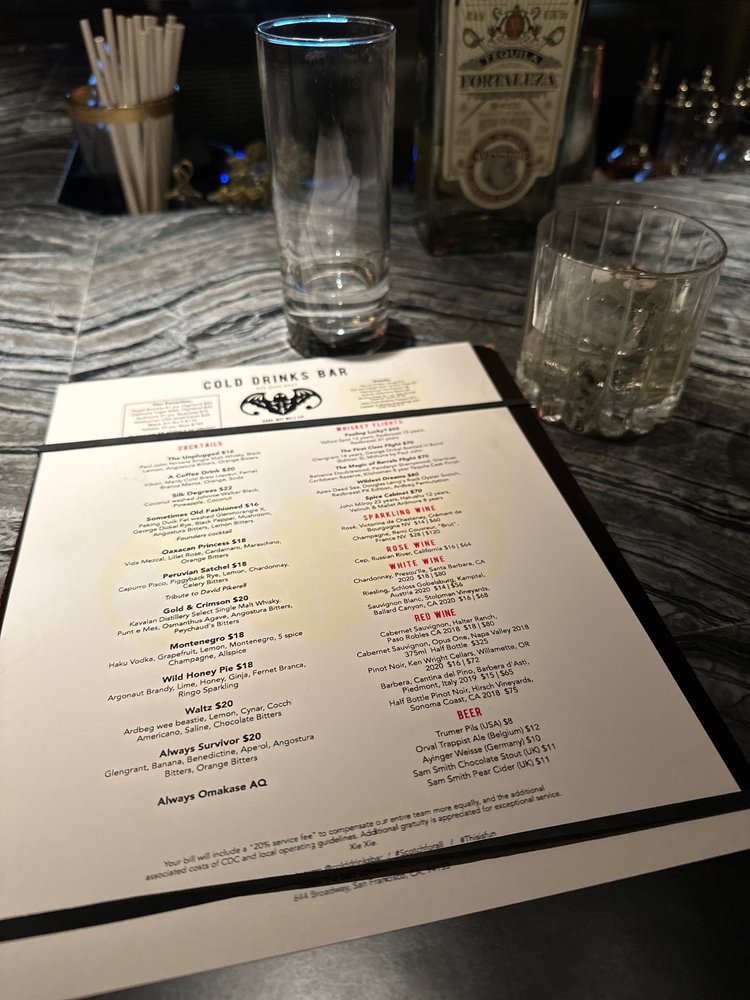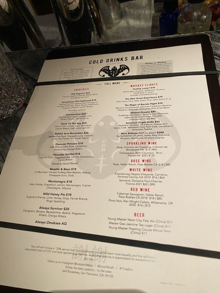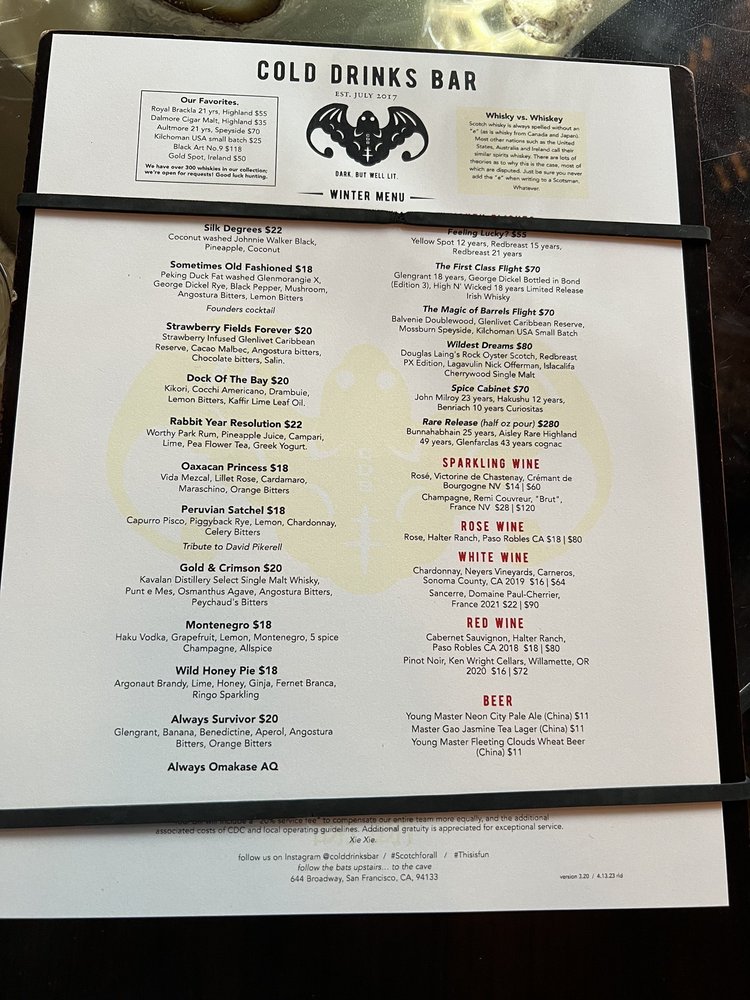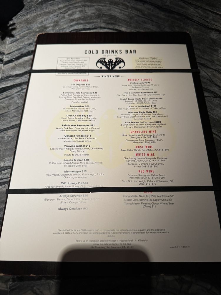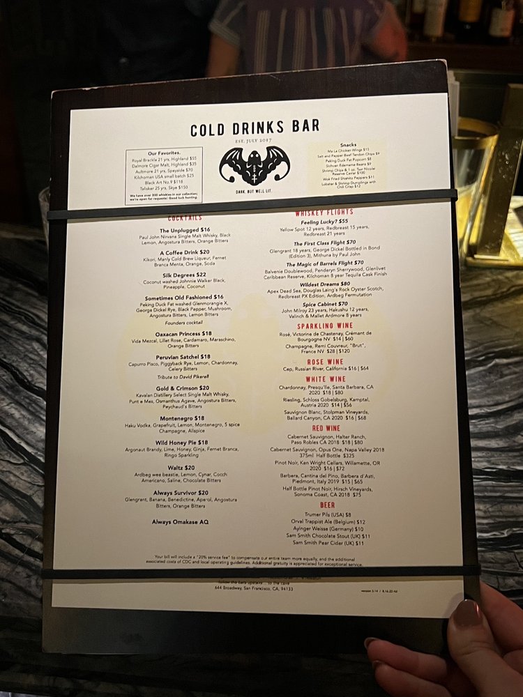 Introducing Cold Drinks Bar: a cocktail bar located at 644 Broadway, San Francisco, offering a romantic, intimate, and trendy setting. Known for their expertly crafted house cocktails like Silk Degrees and Sometimes Old Fashioned, Cold Drinks Bar also boasts a diverse wine selection and a menu of delectable snacks such as Indochine Lobster Imperial Rolls and Peking Duck Fat Popcorn. Customers praise the dark, swanky ambiance and excellent table service, making it a perfect spot for a date night or a chill hangout with friends. With a focus on Japanese whiskies and creative drink options, Cold Drinks Bar is a hidden gem above China Live restaurant in Chinatown. So, if you're looking for a classy and peaceful cocktail bar with a large whiskey selection, Cold Drinks Bar is the place to be.